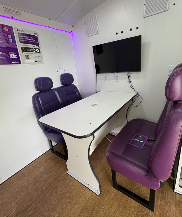 Instalado na Praça do Museu, o ônibus ofereceu atendimentos voltados à orientação jurídica, acolhimento psicossocial, informações sobre prevenção à violência e encaminhamentos para a rede de proteção, fortalecendo o acesso das mulheres jauenses a políticas públicas essenciais.